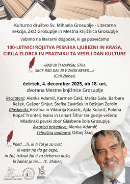 Mesečni kino v občini Grosuplje - vabljeni na decembrsko in januarsko projekcijo!26.11.2025V občini Grosuplje uvajamo novost – enkrat mesečno bomo pripravili kino projekcije, namenjene vsem generacijam. Dogodki bodo potekali v Kulturnem domu Grosuplje, kjer bomo skupaj uživali v filmskih zgodbah na velikem platnu. Sobota, 27. december 2025, ob 11.00 Na ogled bo praznična družinska predstava Božična mišelovka, ki bo poskrbela za pravo decembrsko vzdušje. Sobota, 10. januar 2026 ob 11.00 – Družinska pustolovščina Šola čarobnih živali 3 ob 18.00 – Navdihujoča pripoved Belo se pere na 90 Cena vstopnice je 5 €. Sedežni red ne velja. Vstopnice so na voljo: v Kulturnem domu Grosuplje https://kultura.si/vstopnice/, na mojekarte.si - Božična mišelovka: https://www.mojekarte.si/si/bozicna-miselovka-animirana-pustolovscina/vstopnice-1208190.html, - Šola čarobnih živali