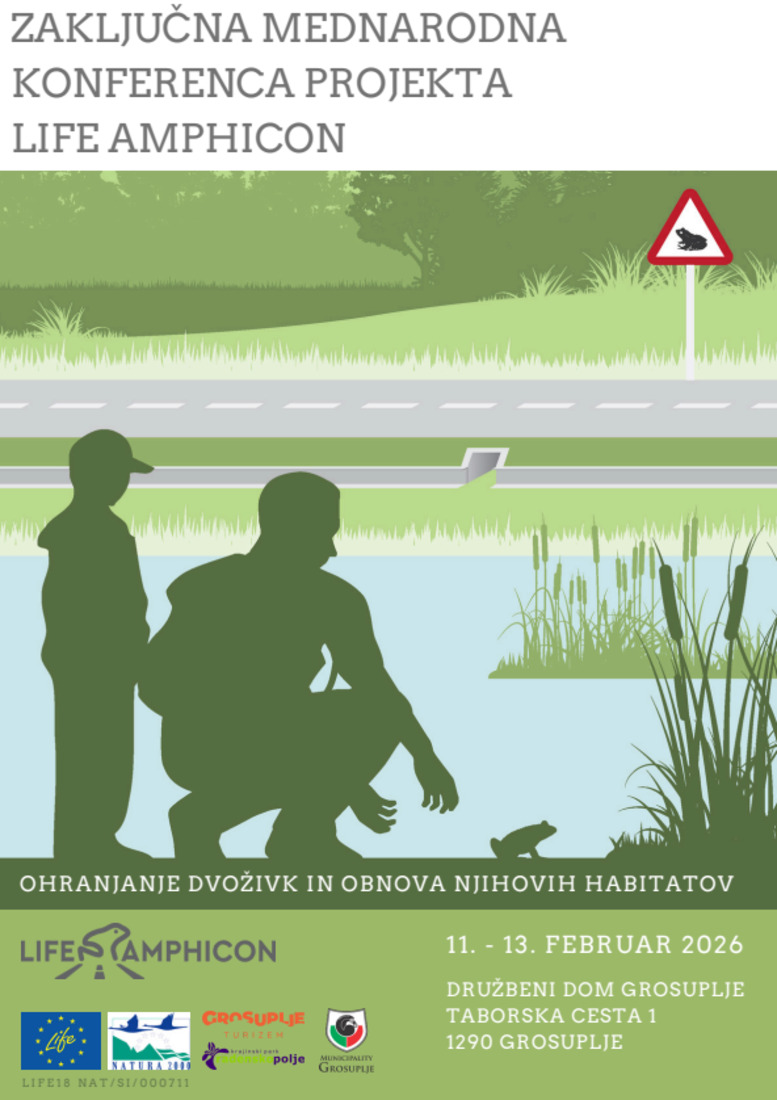 Projekt LIFE AMPHICON se hitro bliža koncu, zato organiziramo Zaključno mednarodno konferenco projekta LIFE AMPHICON, ki bo potekala od 11. do 13. februarja 2026 v Družbenem domu Grosuplje.