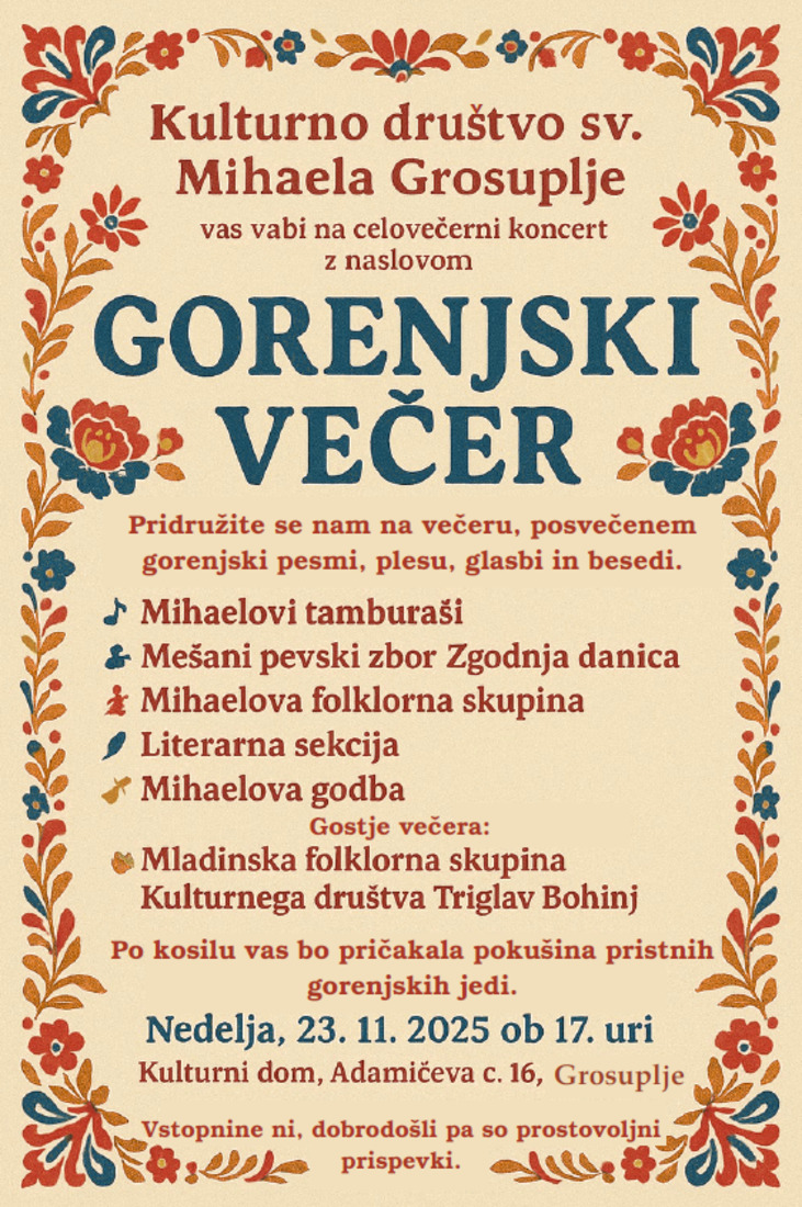 Kulturno društvo sv. Mihaela Grosuplje vas vabi na celovečerni koncert z naslovom GORENJSKI VEČER, v nedeljo, 23. 11. 2025, ob 17. uri, v Kulturnem domu Grosuplje.