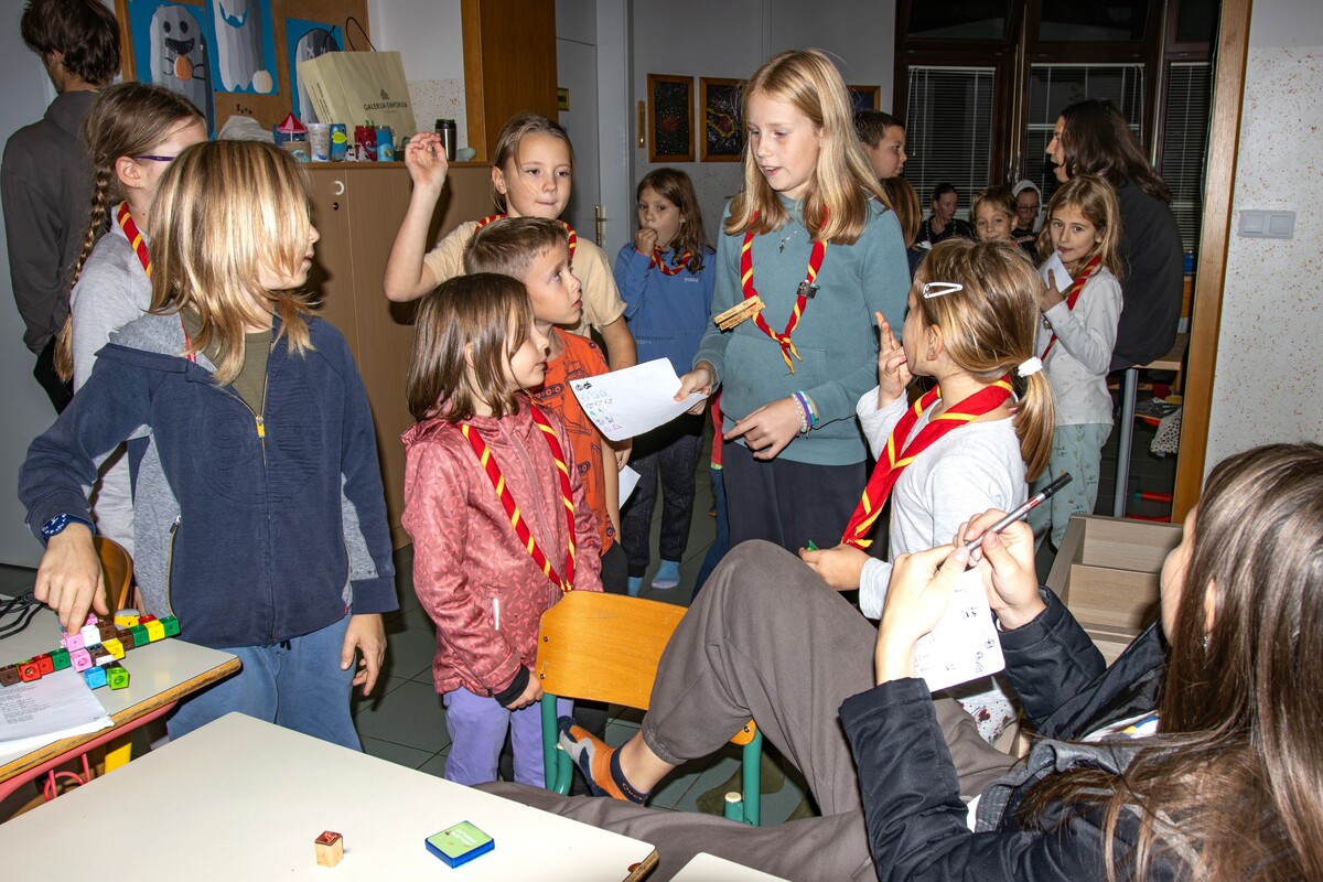 V petek smo se polno spakirani odpeljali izpred gasilskega doma Grosuplje. Hitro si je vsak našel svoj kotiček za spanje in zabava se je lahko začela. S polnimi želodčki smo prvi večer naprezali svoje možgančke, saj so nam vodniki pripravili prav zanimiv kviz. Polni energije smo komaj zaprli oči in se naslednji dan prebudili v lepo sončno jutro. Dneve smo začenjali z jutranjimi zbori, da pa smo se res dodobra prebudili, smo imeli tudi jutranjo telovadbo. V dopoldanskem času so se MČ-ji (otroci med 2. in 5. razredom) spoznavali z različnimi veščinami; od rezbarja, prijatelja gozda do nabiralca in rešilkota. Medtem pa so GG-ji (otroci med 6. in 9. razredom) preizkušali svoje veščine v izrezovanju buč. Glasno navijanje in vzklikanje je odmevalo v popoldanskem času, ko smo se vsi preizkusili v različnih športnih igrah. Dan so najmlajši zaključili z ogledom risanke, starejši pa so igrali družabne igre.