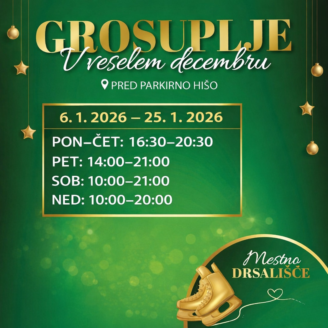 Tečaji drsanja za otroke - 13., 14., 20. in 21.12. med 8.30 in 9.30 ter 3., 4., 10. in 11.1. med 9.00 in 10.00. Več o tečaju in prijave na www.simplisport.si.