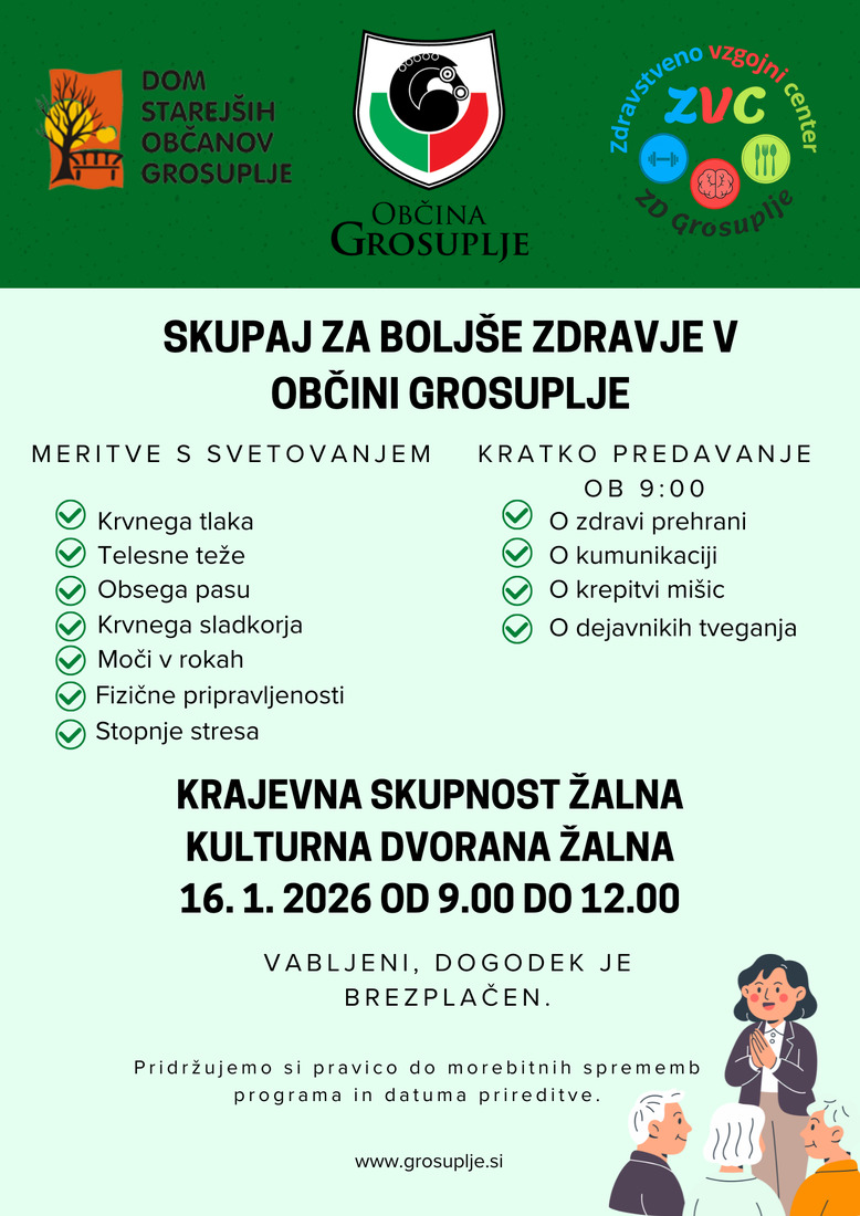 Občina Grosuplje v sodelovanju z Zdravstvenim domom Grosuplje in Domom starejših občanov Grosuplje vabi na delavnice za starejše, namenjene promociji zdravja in dobrega počutja.