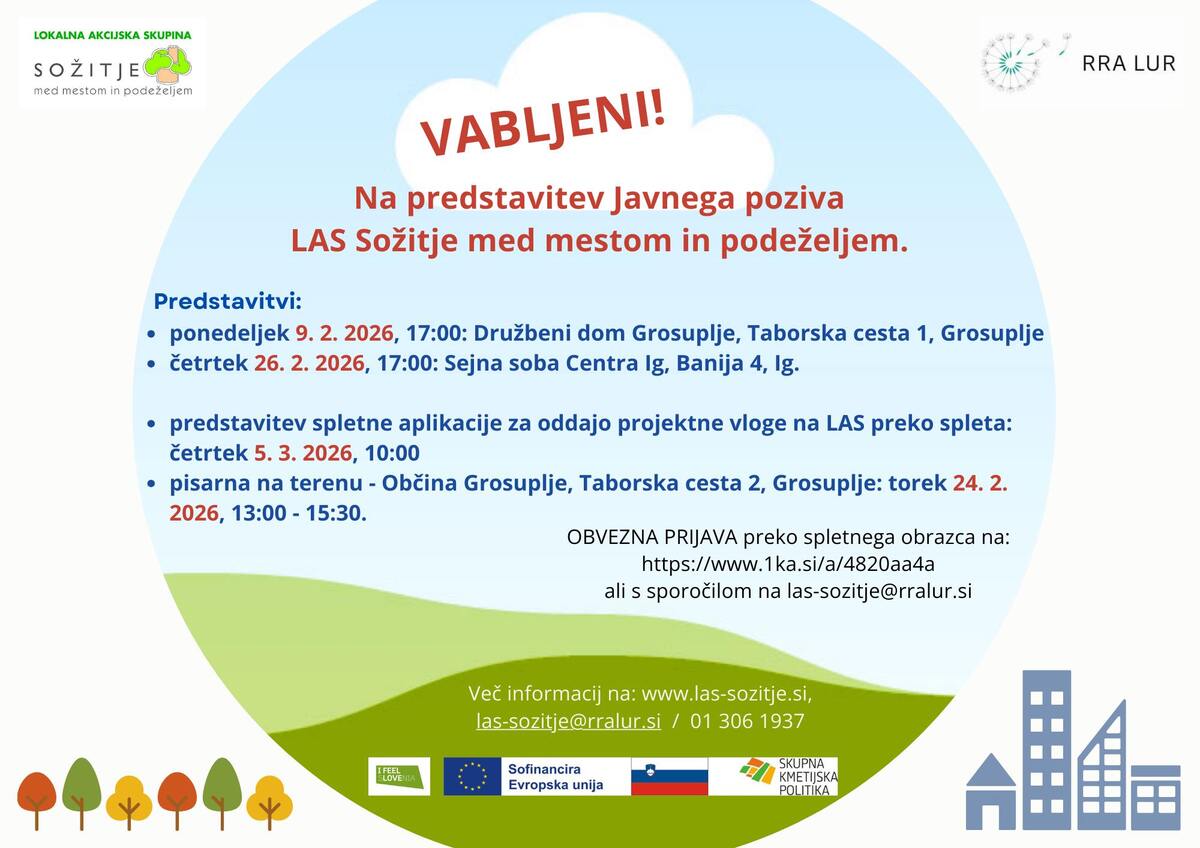 Objavljen je 2. javni poziv za izbor projektov LAS Sožitje med mestom in podeželjem. Več o tem si lahko preberete na povezavi: https://www.grosuplje.si/objava/1229634