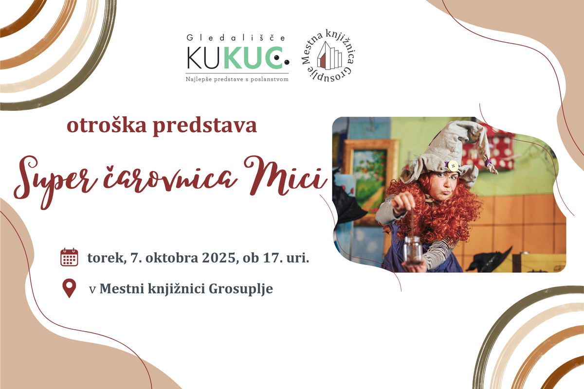 Mestna knjižnica Grosuplje vabi vse otroke v torek, 7. 10. 2025, ob 17. uri, na predstavo Super čarovnica Mici v izvedbi KU-KUC gledališča. Iskriva zgodba o mali poredni coprnici Mici je polna napetih preobratov, presenečenj, čarovnij in smeha in je kot nalašč, da z njo začnemo novo sezono pravljičnih uric.