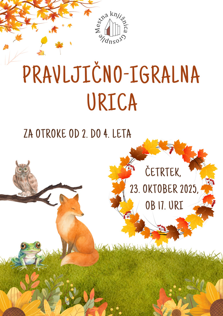 Mestna knjižnica Grosuplje vabi v četrtek, 23. oktobra 2025, ob 17. uri, na pravljično-igralno urico, ki je namenjena otrokom od 2. do 4. leta.