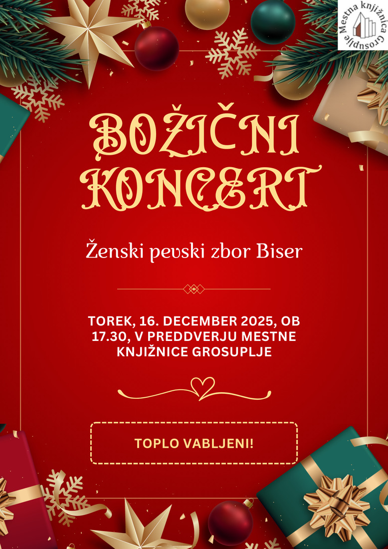 Vabljeni v preddverje Mestne knjižnice Grosuplje na božični koncert ŽPZ Biser, ki bo v torek, 16. decembra 2025, ob 17.30.